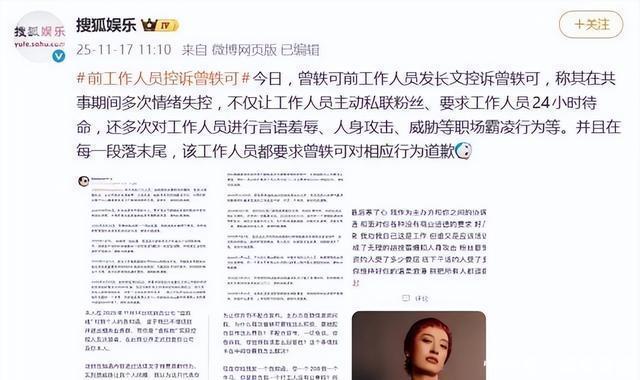 曾轶可的前工作人员于2025年11月17日在社交平台发布长文,控诉在2021年至2025年期间的职场霸凌行为。长文中列举了13起具体事件,包括情绪失控、在公开场合进行言语羞辱、人身攻击和威胁。2024年8月在北京三里屯开会时,曾轶可拍桌子导致刀叉飞向工作人员。2024年9月在长沙草莓音乐节,她让工作人员私联粉丝提供特殊待遇。 2024年10月,她要求工作人员在演出前捂嘴以防泄露信息,但失败后威胁告对方。长文还提到曾轶可引导粉丝网暴他人,并要求公开道歉。曾轶可的公司随后发出告知函,要求该工作人员闭嘴,否则追究法律责任。该事件引发网友回忆曾轶可过往行为,包括迟到、耍大牌和扔粉丝礼物。网友还扒出她2022年跨年演出时冷脸对待工作人员,以及2019年大闹机场事件。