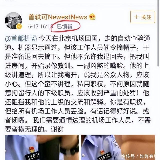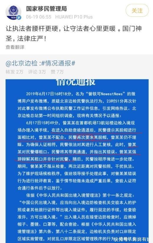 2019年6月17日下午,曾轶可在微博发文称在首都机场入境时遭到工作人员刁难。她描述自己在自动查验通道被要求摘帽子,当准备退回摘下时,被叫进房间录像教训。她称对方一副领导做派,并曝光了民警的工作证件号码。发文后,该微博迅速引发热议,北京边检部门于6月19日早晨发布通报,说明事件经过。通报指出,曾轶可在进入自助查验通道后,民警提示其脱帽进行面相核验,她不配合,导致系统无法正常核验身份。民警依法对其进行人工复核,她不仅拒绝,还对民警爆粗口辱骂。民警将其带离通道进行训诫,值班领导介入后,鉴于情节轻微未造成严重后果,查验人证符合后放行。但她随后偷拍民警警号并发到网上,称工作人员滥用职权应受惩罚,并不承认辱骂行为。此举干扰了正常执法秩序。