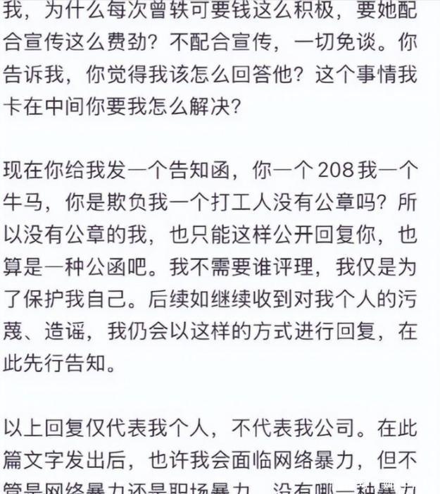 职场霸凌事件细节进一步曝光。长文中提到,2021年,曾轶可在录音棚情绪失控,砸设备。2022年,她威胁工作人员泄露隐私。2023年,她在巡演中让工作人员跪地捡东西。2024年,她多次私联粉丝,提供门票和后台通行证,违反公司规定。该工作人员称这些行为持续四年,导致心理创伤。网友联想到2019年机场事件中她不承认辱骂,称她习惯推责。机场事件后,她的小号发文翻脸,质疑边检,但大号道歉。